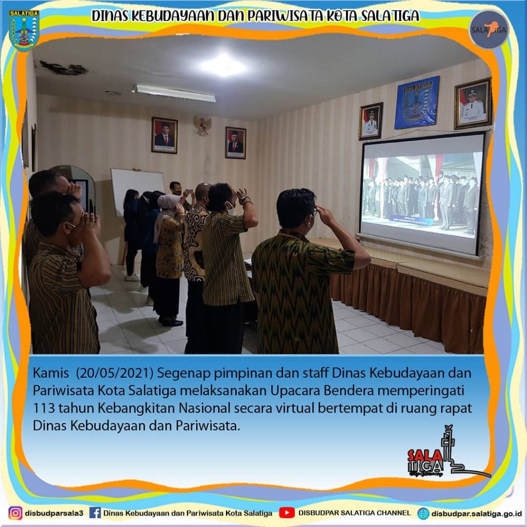 Kamis (20/05/2021) Segenap pimpinan dan staff Dinas Kebudayaan dan Pariwisata Kota Salatiga melaksanakan Upacara Bendera memperingati 113 tahun Kebangkitan Nasional secara virtual bertempat di ruang rapat Dinas Kebudayaan dan Pariwisata.